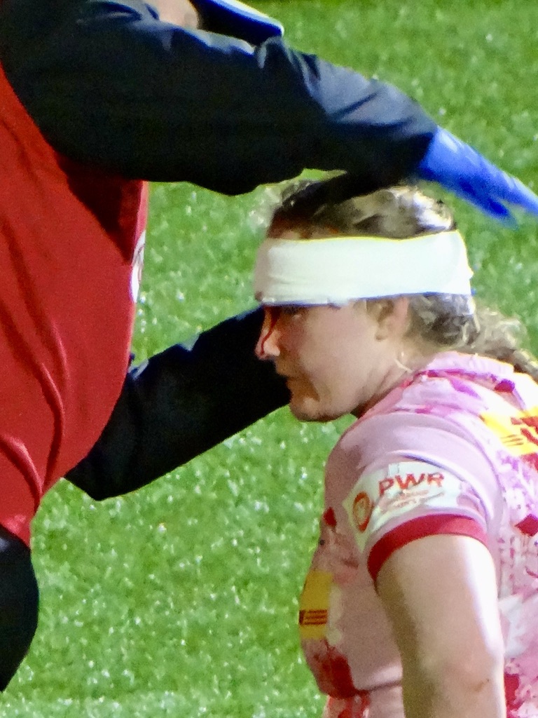 Blood trickled down her face from a challenge, but with a Terry Butcher-style bandage wound round her head, she continued regardless, helping Quins over the line (literally) with all-round heroics and specifically a hat-trick of tries.