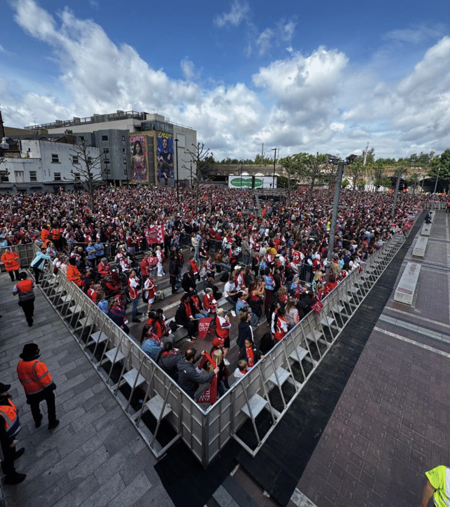 Pink Street was packed! Waves of Gooner jerseys flooded the floor, so much so you couldn’t tell that the street was even pink – looked pretty red to me!