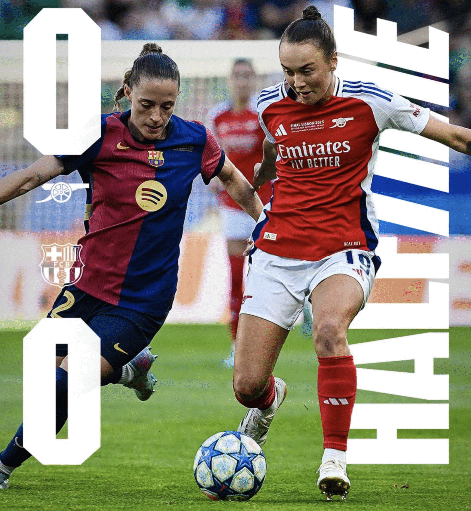 Bonmati’s shot goes wide. Leah Williamson and Van Domselaar both continue to dominate in the air and shut up shop. More and more Barça crosses fly in and Arsenal keep them out.