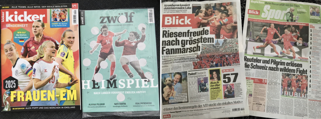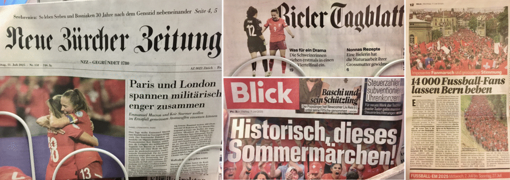 Daily newspapers, notably Blick, put their newly minted heroines on the front pages of their main and sports section with splashy headlines. “Huge joy after the biggest fan march” “Reuteler and Pilgrim redeem Switzerland after a wild fight”. And, of course: “Historic, this summer fairytale!” “With a 1-1 draw against Finland, the national team plays its way into the European Championship quarter-finals and into our hearts. Now everything is possible”