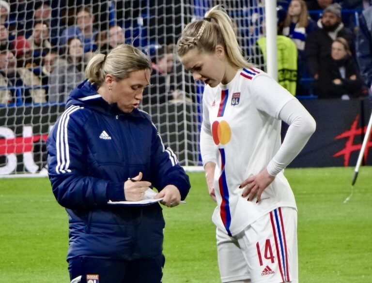 We hear about how Sonia took over the head coach role at OL (above, right), and changed things to lead the team to a Champions League win against Barcelona by installing rigorous methods and working conditions. The book concludes with her departure from Lyon after three full seasons, and her move to Chelsea.