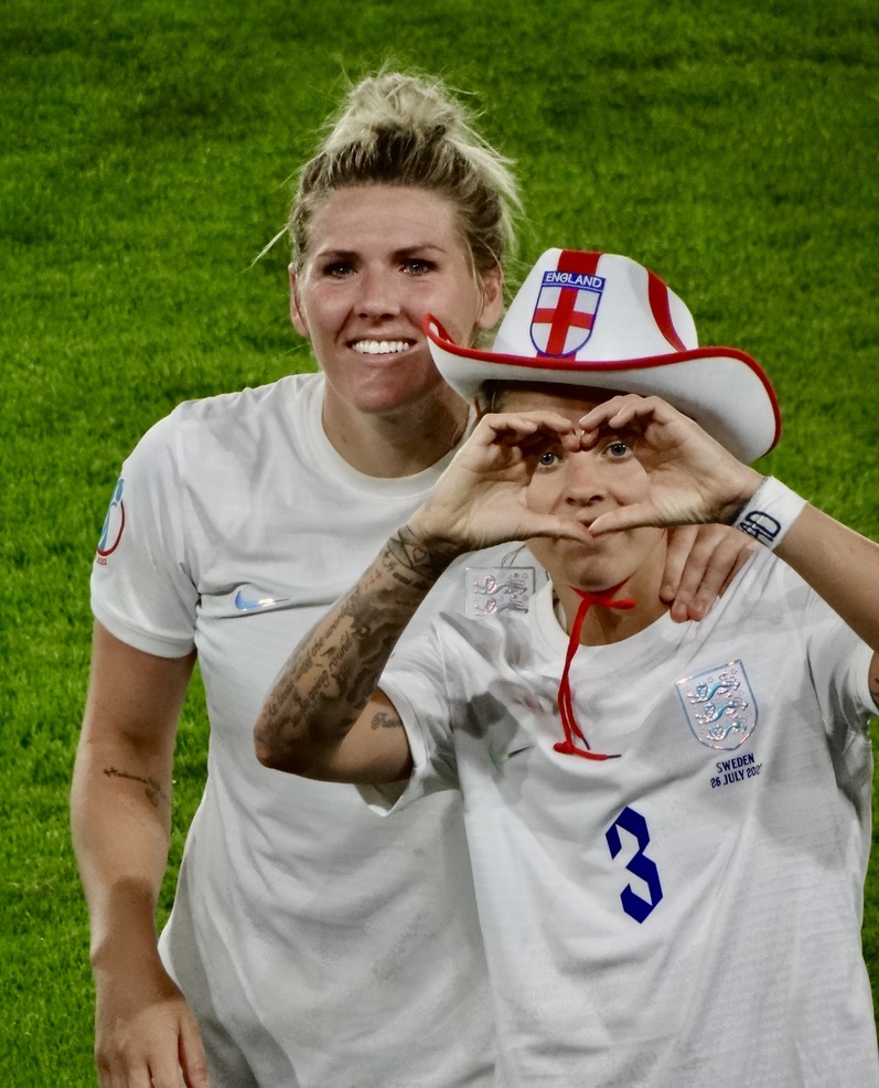Millie Bright (above, right, with Rachel Daly) won the Euros in 2022 while wearing two sports bras, because she felt one wasn’t supportive enough.
